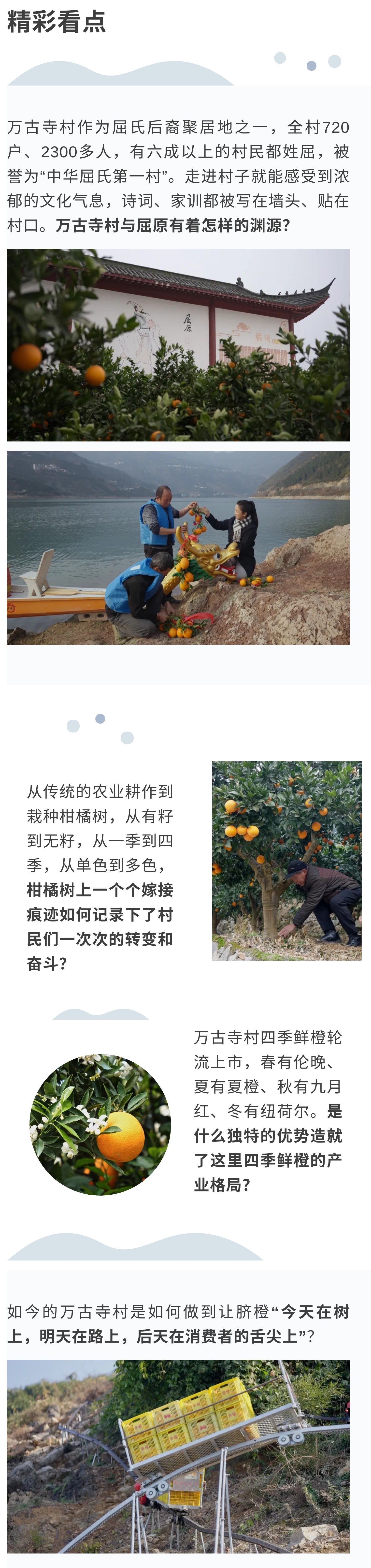 让我们跟随镜头一起走进“中国脐橙之乡”,走进万古寺村,感受屈原文化的魅力,看脐橙如何香飘四季,装点人们的诗意生活!看屈氏后裔如何不断求索谱写乡村振兴的新篇章!