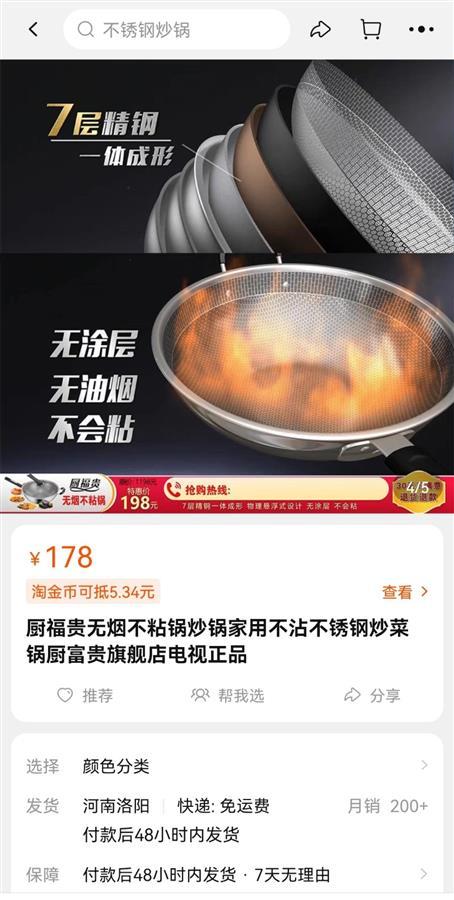 刘先生来自吉林辽源。2月14日前后,他看到吉林当地某电视台的一则广告,宣传的是名为“厨福贵”的不粘锅:“无涂层、无油烟、不会粘”。他随后扫码支付了198元。2月18日傍晚,刘先生收到锅,按照说明书的步骤开锅,完毕后开始炒鸡蛋。令他意外的是,鸡蛋粘锅了,不仅如此,锅表面变成了深黑色,不一会儿开始冒烟。