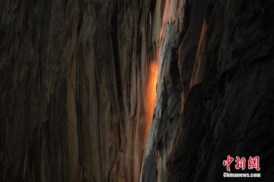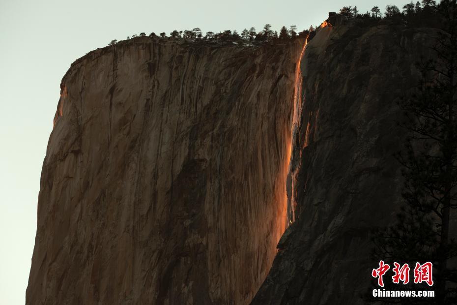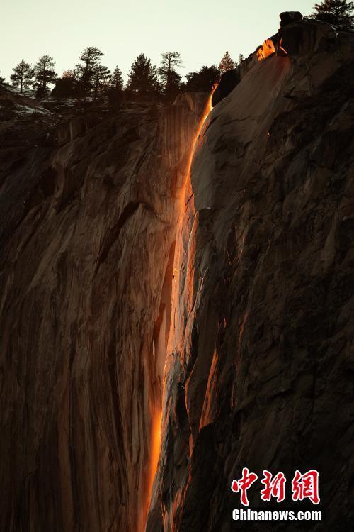 当地时间2月23日,美国加州优胜美地“火瀑”因雪山融水不足而瘦身,被夕阳照射的水流似岩浆涓涓而下。优胜美地国家公园每年二月下旬的夕阳照射在马尾瀑布上形成岩浆飞流直下的效果被人们成为“火瀑”。 中新社记者 廖攀 摄