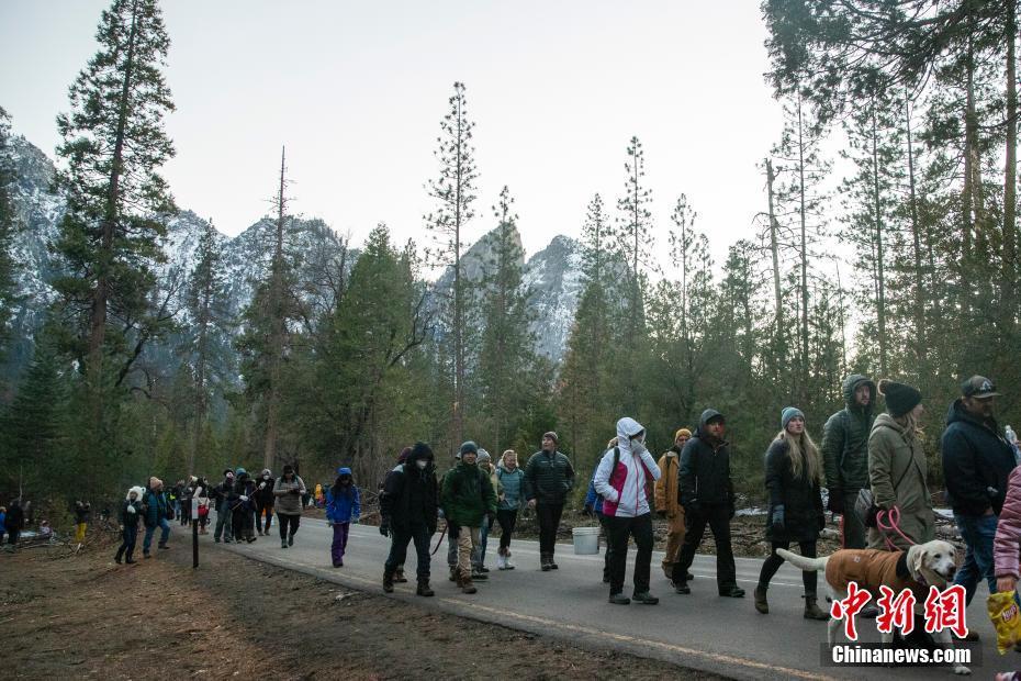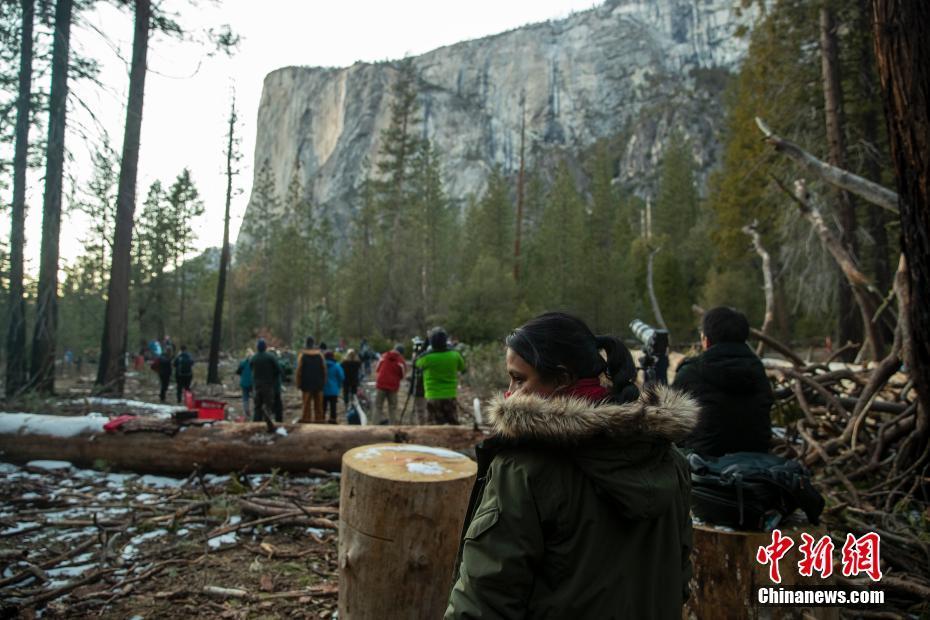当地时间2月23日,美国加州优胜美地“火瀑”因雪山融水不足而瘦身,被夕阳照射的水流似岩浆涓涓而下。优胜美地国家公园每年二月下旬的夕阳照射在马尾瀑布上形成岩浆飞流直下的效果被人们成为“火瀑”。图为人们成群结队观赏“火瀑”景观。 中新社记者 廖攀 摄