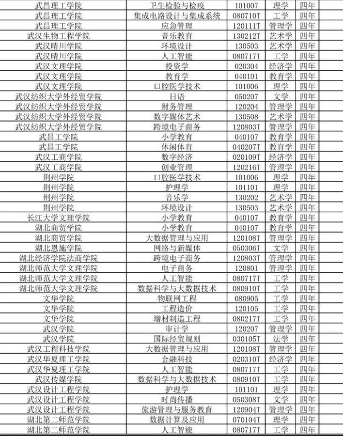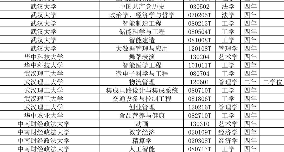 新增审批本科专业4个,分别是华中科技大学临床药学、湖北大学密码科学与技术、湖北师范大学运动训练、武汉商学院运动训练;