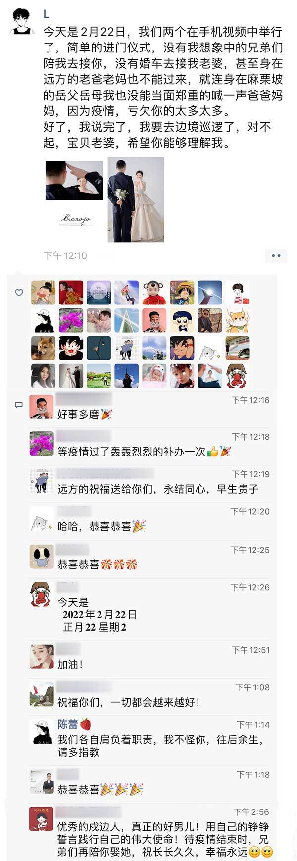 有战友注意到,在执勤路上,陈龙一直在看时间,还疑惑陈龙是不是连日连夜工作疲惫了。他确实在看时间,当天12点是两人结婚的“吉时”。