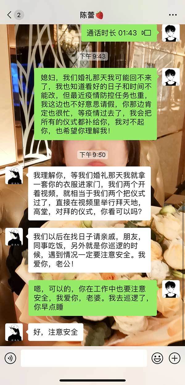 12点整,陈蕾脱下疾控中心红色工作服,着便服“过门”,与视频另一头穿着冬执勤服的陈龙拜堂成亲。听到“礼成”那一刻,所有人潸然泪下。