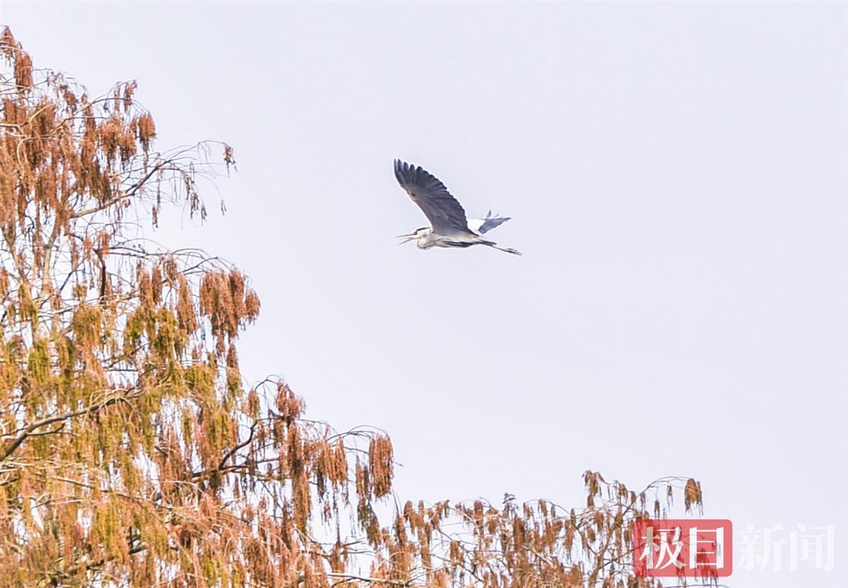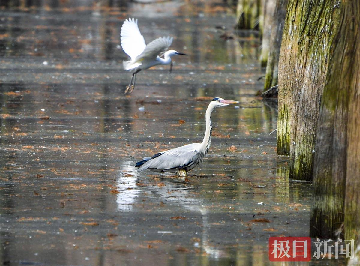 沿着木栈道走近细观之,夜鹭、白鹭藏在池杉林深处,不时飞起又藏身。“鸟儿很聪明,你看它们的鸟巢都建在森林核心圈里。”新洲区林科所是水上森林责任单位,所长徐峰卫介绍,此栈道于2018年修建在水上森林外围,满足市民观鸟的需求,又不惊扰它们。