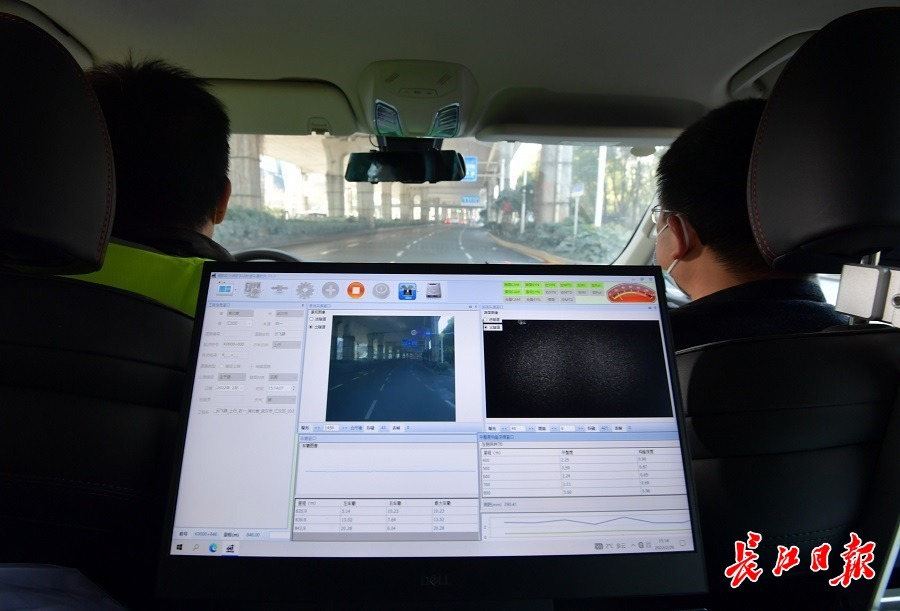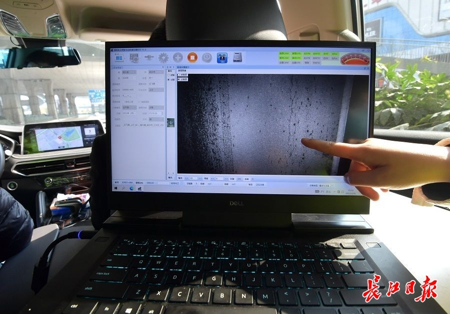 长江日报在车载电脑屏看到,路面破损、车辙,构造深度,平整度等检测数据不停变化。坐在显示屏前的技术人员能马上看出道路端倪,精准“号脉”。