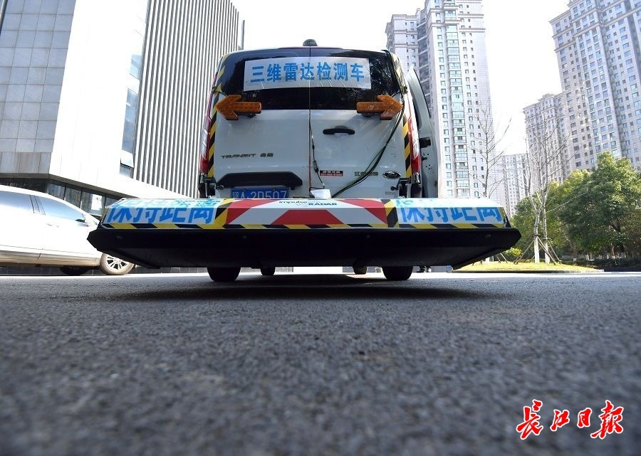江汉区城管局城市道路桥梁管理中心巡检员张亚云说,这是探地雷达装置,紧贴地面方向有16个雷达模块,不停地向地下发射脉冲雷达信号,可检测道路3米到5米深度。包括采集数据、生成图像、识别图像、判断病害、建立台账、养护计划等道路检测各个环节。