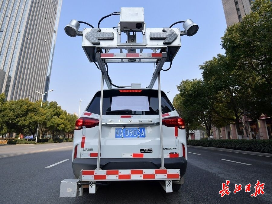 2月26日下午,在汉口青年路,一台车身标有“道路综合检测车”也在路面巡检。只见车后支架上有两台补光灯,车前车后各有一台可转动的高清摄像头。