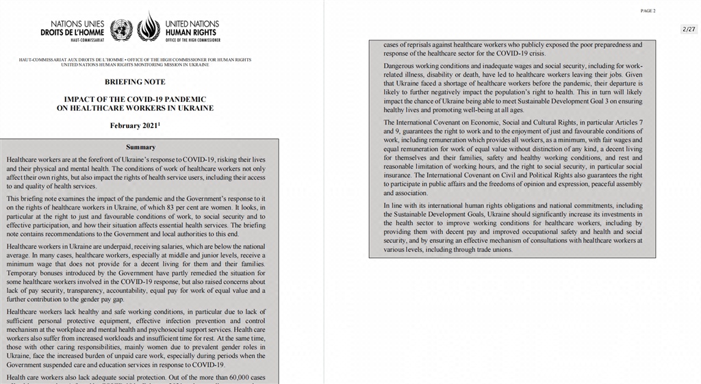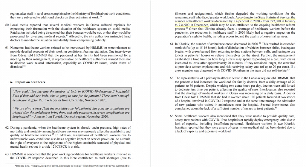 根据联合国乌克兰人权事务高级专员办事处(United Nations Human Rights Office Of The High Commissioner)2021年2月发布的《新冠疫情对乌克兰医务工作者影响》的报告数据,根据乌克兰国家统计局的数据,2020 年医护人员人数减少了 5.4%——从 1 月的 777000 人减少到 12 月的 734900 人。其中,工作量增加、休息时间不足和工资不足是许多医护人员离职的原因。
