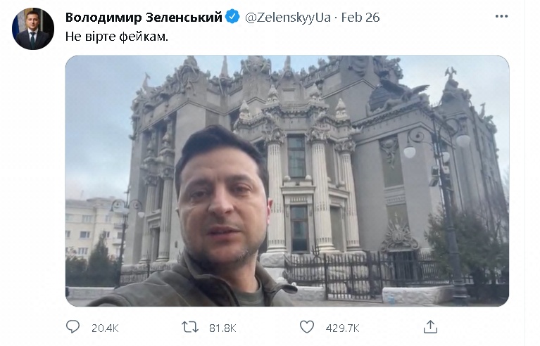 不过,泽连斯基26日曾在推特发布一则长约40秒的视频,呼吁乌克兰民众不要相信“虚假信息”,并称不会放下武器。
