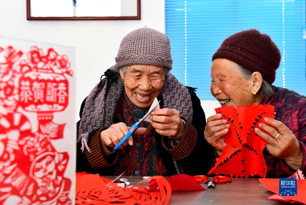 2月27日,在日照市岚山区虎山镇黄家峪村养老服务中心,两位老人边剪纸边聊天。