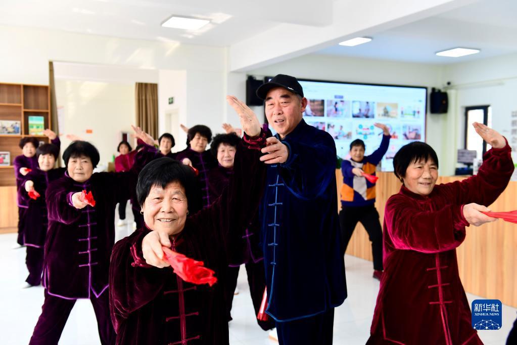 2月27日,在日照市岚山区安东卫街道凤凰山社区养老服务中心,老人们练习太极扇。