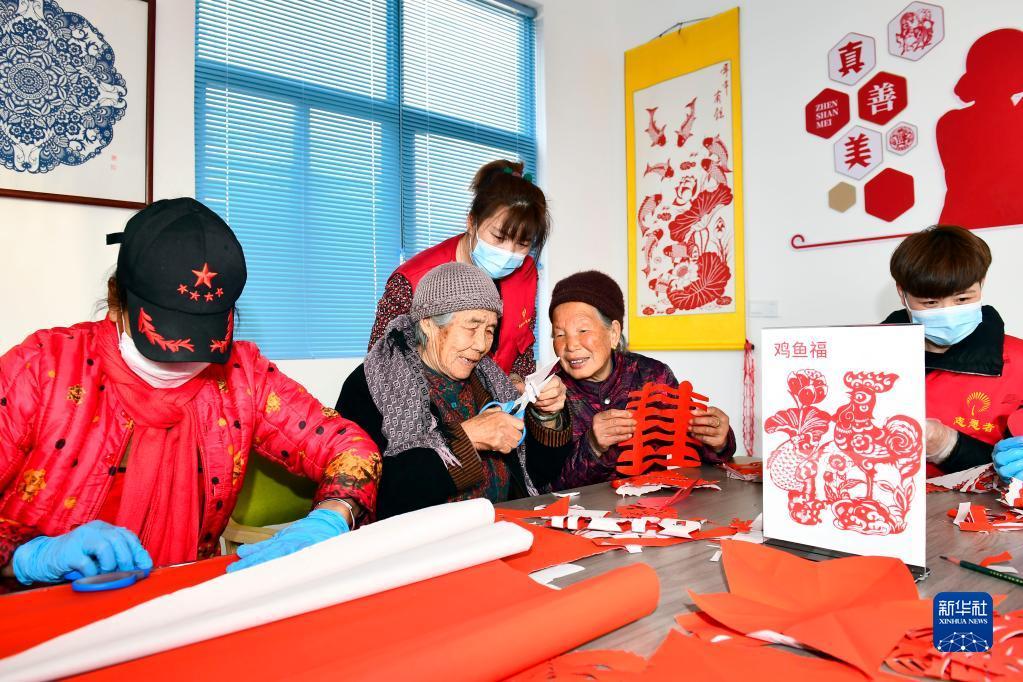 2月27日,在日照市岚山区虎山镇黄家峪村养老服务中心,“红辉暖心”志愿服务队队员陪老人剪纸、聊天。