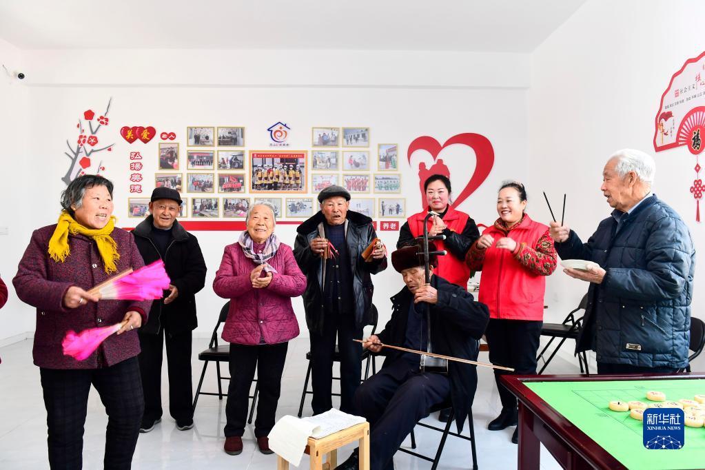 2月27日,在日照市岚山区虎山镇黄家峪村养老服务中心,老人们排练文娱节目。