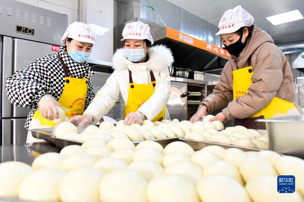2月27日,在日照市岚山区安东卫街道凤凰山社区养老服务中心,“红辉暖心”志愿服务队队员为老人准备午餐。