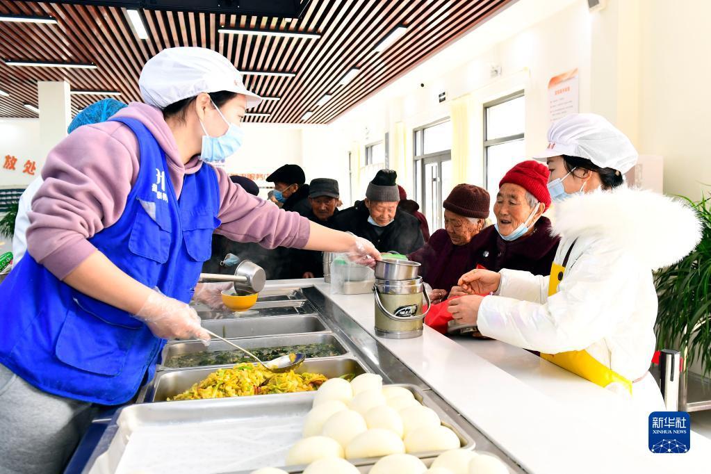 2月27日,在日照市岚山区安东卫街道凤凰山社区养老服务中心,工作人员为老人盛午餐。