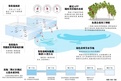 目前,基地内二期40个集装箱正在调试中,集装箱旁5个形状各异的池塘也已成型。金敏说,为更好实现水质净化,二期的尾水经过干湿分离后将经过五道净化,“第一个池中我们会喂养泥鳅,进一步吸收水中的鱼粪,第二个水池将对粗悬浮物进行再拦截,第三个池中通过种植美人蕉等挺水植物,吸收水中的氨氮,第四个水池则会铺满火山石进行净化,最后进入第五个净水池”。