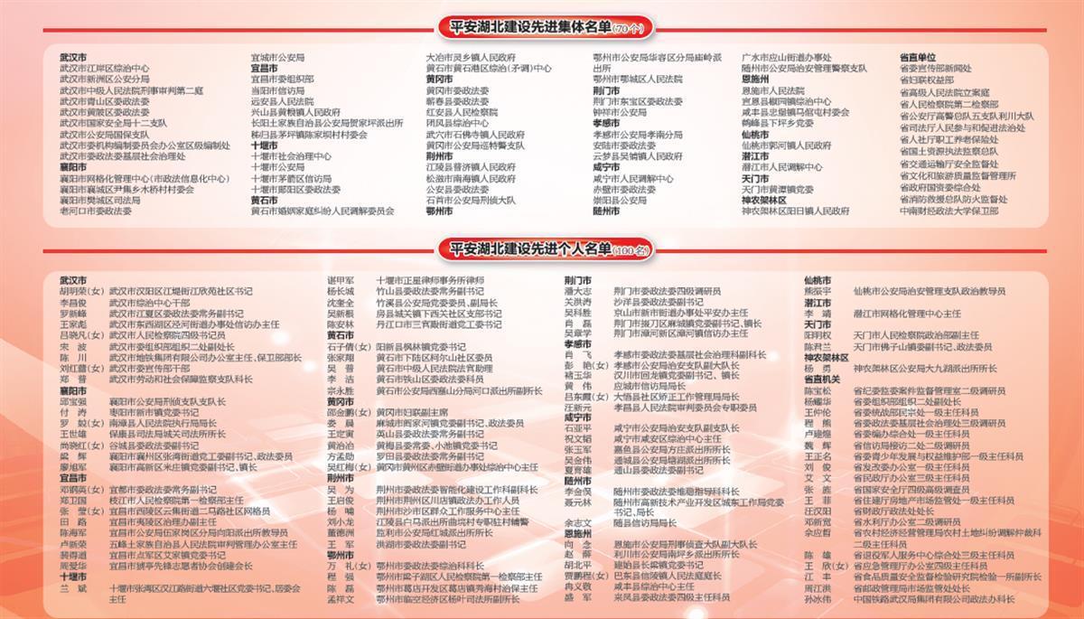 2月28日,平安湖北建设工作会议暨平安湖北建设表彰会在汉举行。省委平安湖北建设领导小组、省人社厅联合对2018年以来全省涌现出的70个平安湖北建设先进集体和100名平安湖北建设先进个人进行表彰(名单附后)。