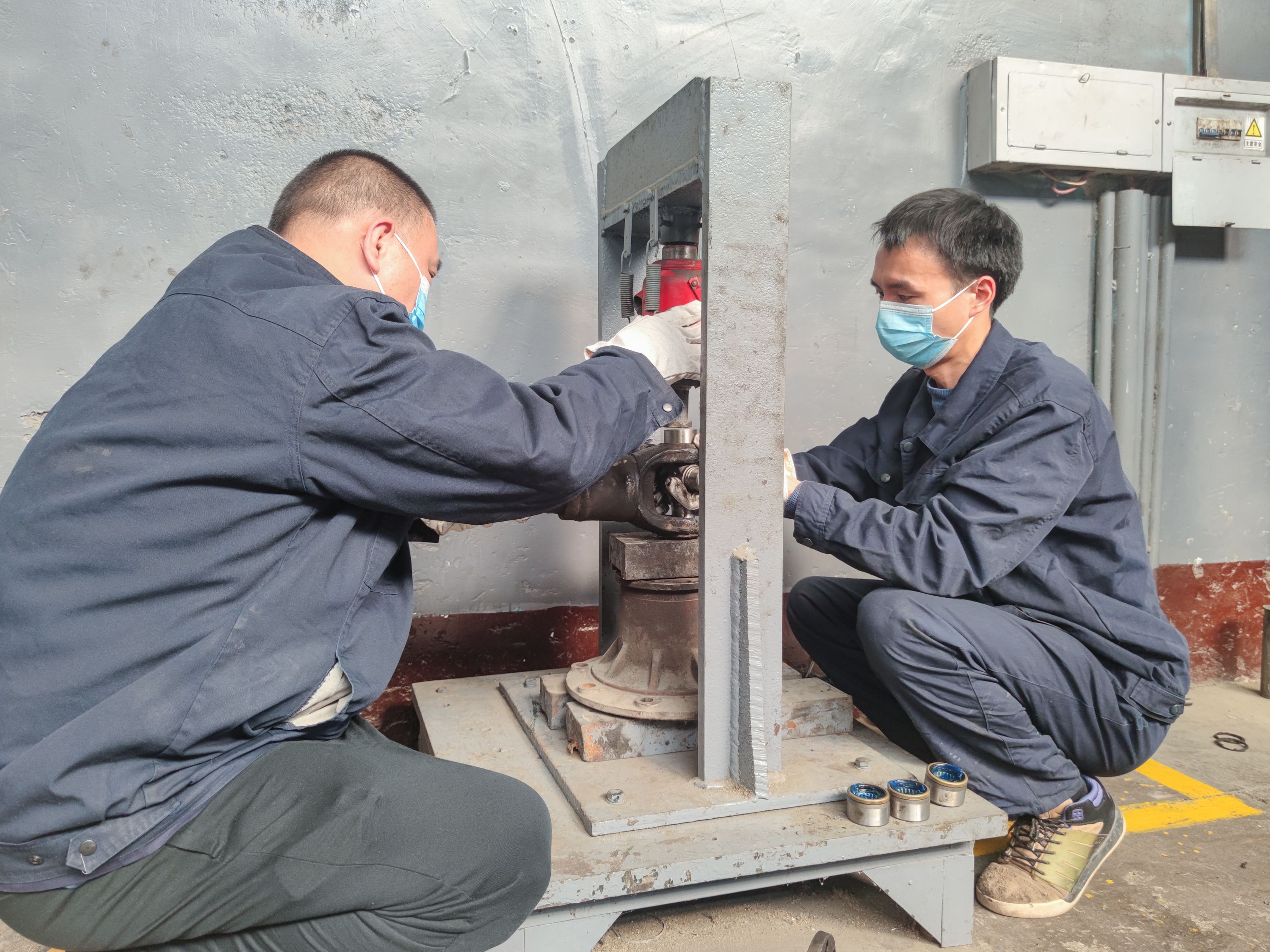 谢军(左)和王正坤(右)正在更换十字轴。记者雷衎 摄