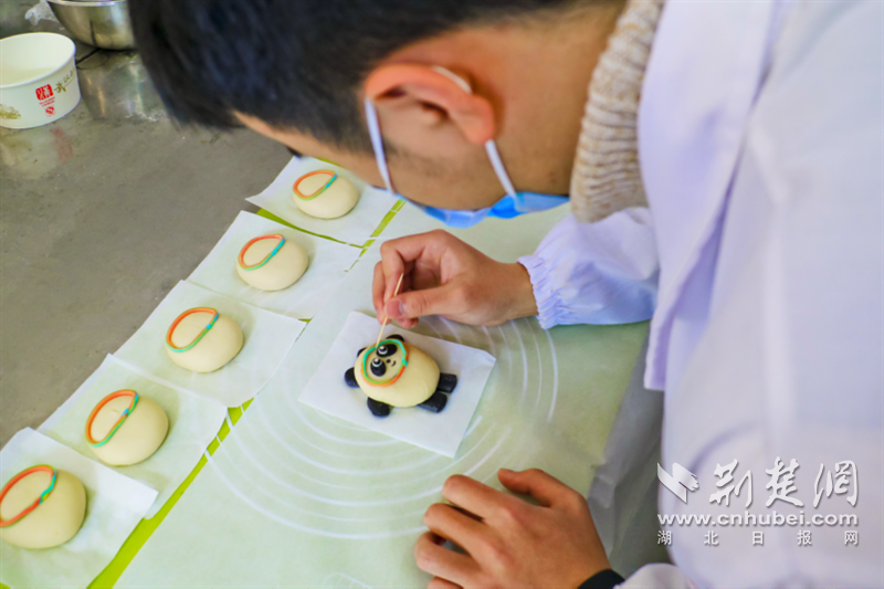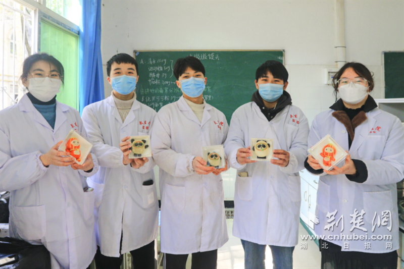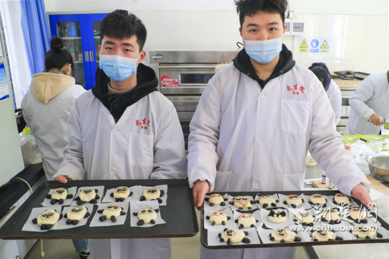 荆楚网(湖北日报网)讯 (通讯员 程晓璐 曹莉芳 朱乔丹 陈冲)北京冬奥会已经圆满落幕,但顶流吉祥物“冰墩墩”依然热度不减。火爆出圈,好多网友直呼“一墩难求”。而在武汉生物工程学院食品科技学院的课堂上,授课教师王利利和负责面点、焙烤工艺实验教学的陈烈琴老师带领学生们,在传统面点制作工艺的基础上,以发酵的小麦面胚为主体,再用可可粉、豆沙和莲蓉等食用原料巧妙搭配,创意制作出形象逼真、憨态可掬的“冰墩墩”花馍。同学们大呼:太可爱了!根本舍不得下口!
