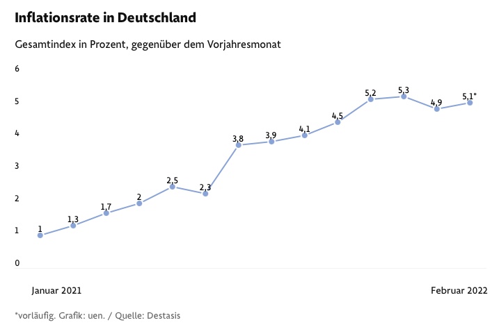 根据德国联邦统计局当地时间3月1日公布的初步数据,德国2月通胀率升至5.1%,比1月增长了0.2%。数据显示,2月德国能源价格同比上涨22.5%,依旧是推高通胀的主要因素。