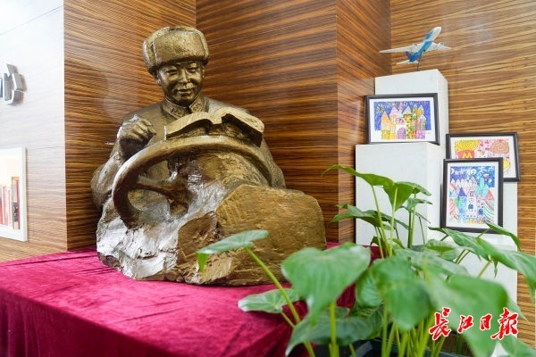 长江日报大武汉客户端3月3日讯 (记者杨枫 通讯员吴海英)学雷锋日快到了,武汉小学的师生们惊喜地发现,学校的“彩虹大道”开放阅读区多了一尊极为传神的雕像——一位头戴毡绒军帽的战士,脸上带着微笑,手里握着钢笔,笔记本在他胸前的汽车方向盘上打开,他凝神正准备写下什么文字……