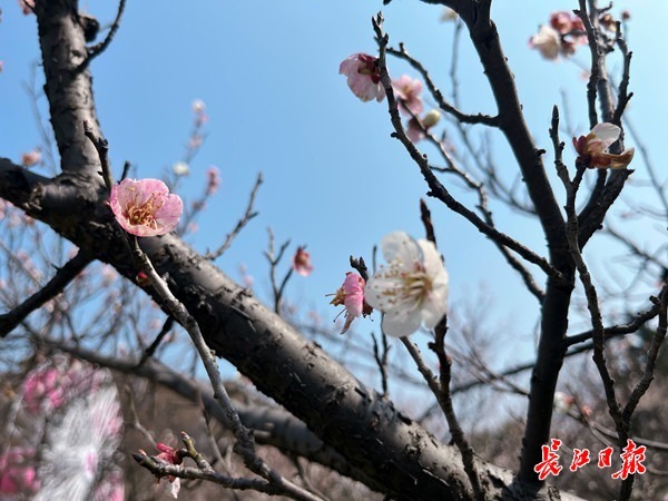“为啥一棵树上的花有两种颜色?”“梅祖宗什么时候开花?”当天,东湖梅园古梅园内人气高涨,“跳色”梅树雪梅成为摄影爱好者争先创作的对象,800岁的“梅祖宗”前簇拥着慕名前来的游客。“目前园内梅花已开至九八成,本周末观赏为佳。‘梅祖宗’是美人梅,属于晚花品种,将在3月8日左右绽放。”正在巡园的中国梅花研究中心高级工程师江润清停下脚步,对游客的提问耐心解答。