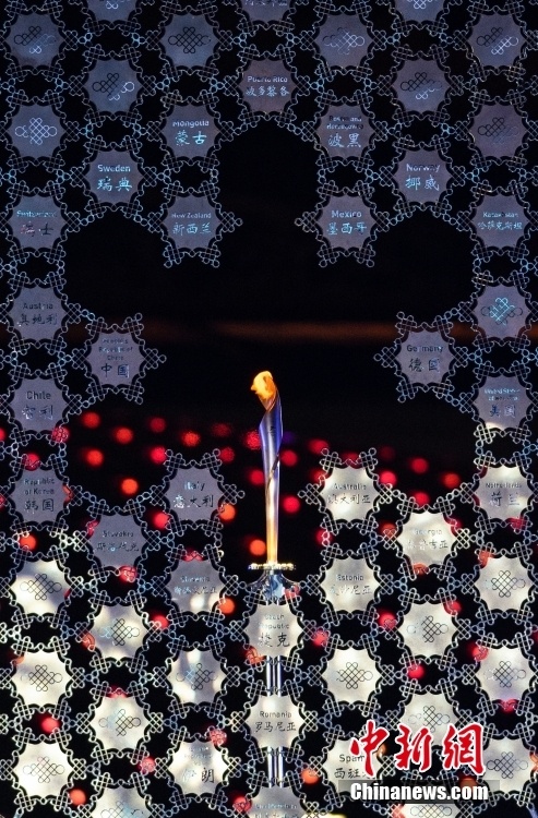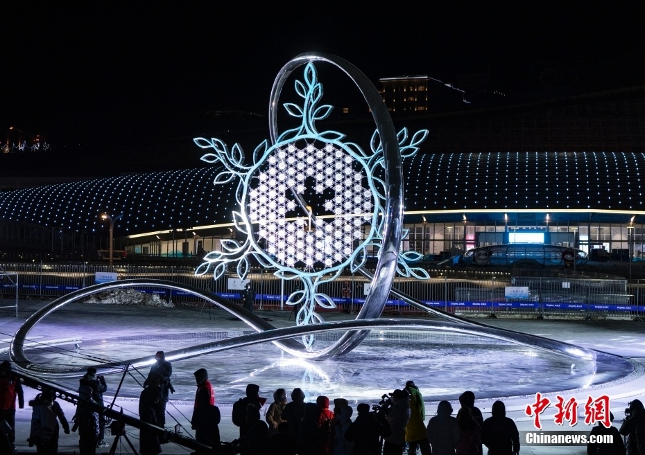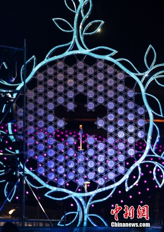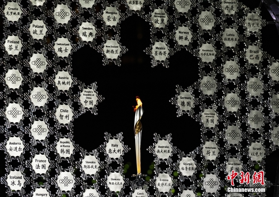 3月4日晚间,北京2022年冬残奥会张家口赛区颁奖广场上,北京冬残奥会火炬与北京国家体育场“鸟巢”的主火炬同步点燃。当天,北京2022年冬残奥会开幕。图为点燃后的火炬台向公众展示。中新社记者 侯宇 摄