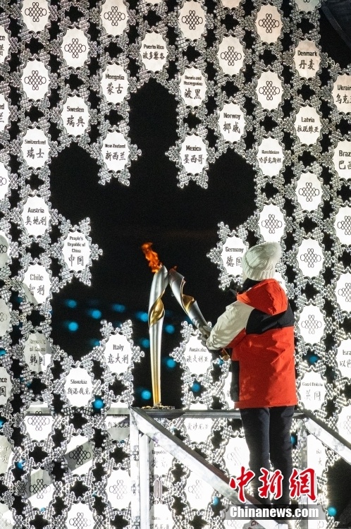 3月4日晚间,北京2022年冬残奥会张家口赛区颁奖广场上,北京冬残奥会火炬与北京国家体育场“鸟巢”的主火炬同步点燃。当天,北京2022年冬残奥会开幕。图为火炬手点燃火炬台的瞬间。 中新社记者 侯宇 摄