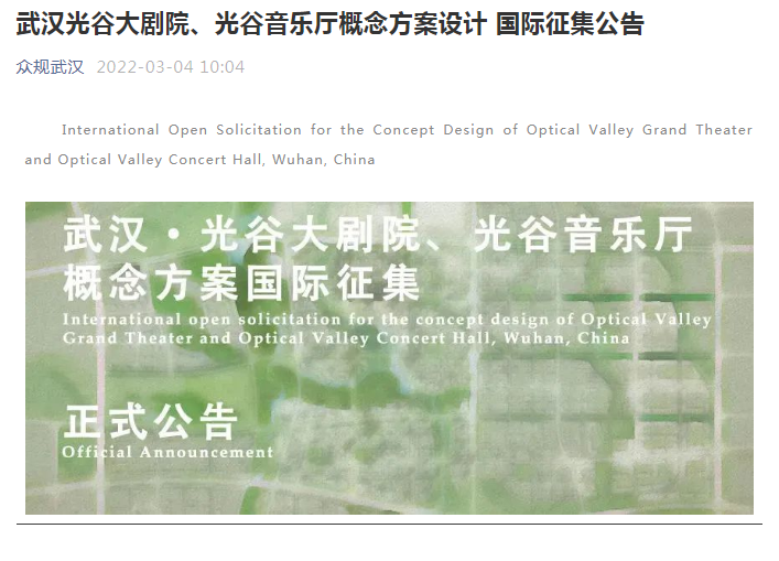 3月4日,武汉市自然资源和规划信息中心微信公众号发布公告称,武汉光谷大剧院、光谷音乐厅两处文化项目正式对全球征集概念方案,规划位于光谷中心城范围内。