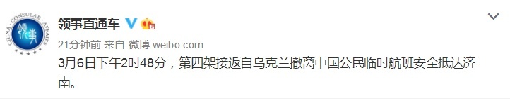 3月6日下午2时48分,第四架接返自乌克兰撤离中国公民临时航班安全抵达济南。