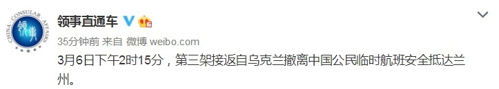 3月6日下午2时15分,第三架接返自乌克兰撤离中国公民临时航班安全抵达兰州。