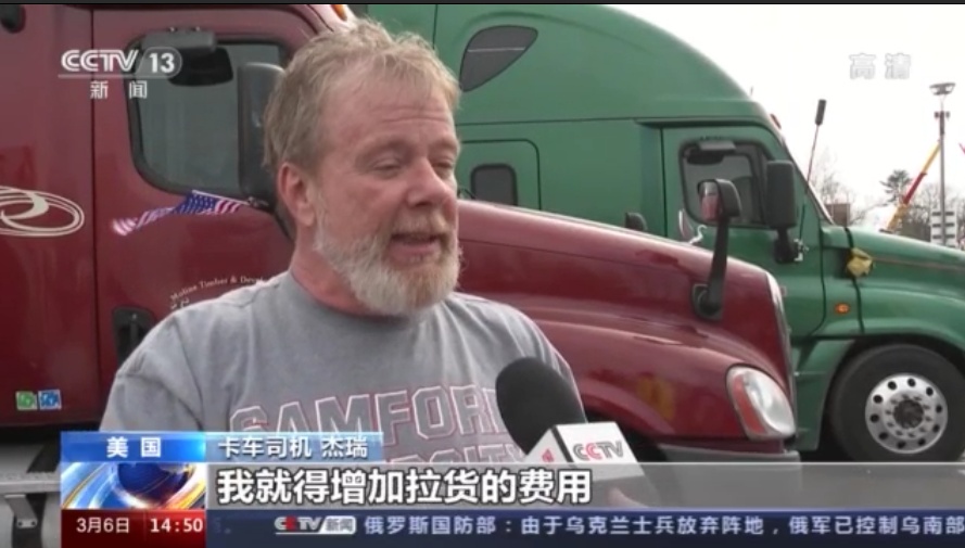 卡车司机 杰瑞:就像我拉货时,(燃油价格提高)我就得增加拉货的费用,而这一切最终将流向商店的客户,你买的杂货和一切你买的任何东西(都要涨价)。
