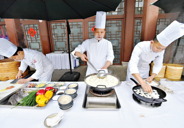 厨师们正在做武汉的名菜鱼丸。