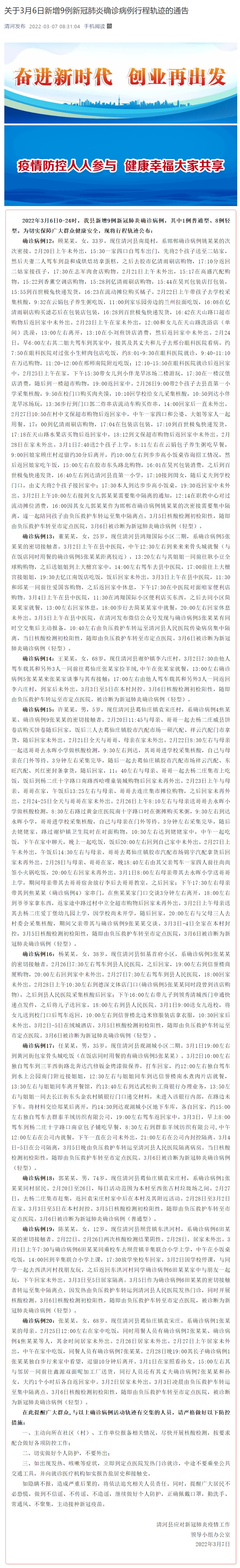 3月7日,河北清河县应对新冠肺炎疫情工作领导小组办公室公布9例新冠肺炎确诊病例行程轨迹,详情如下: