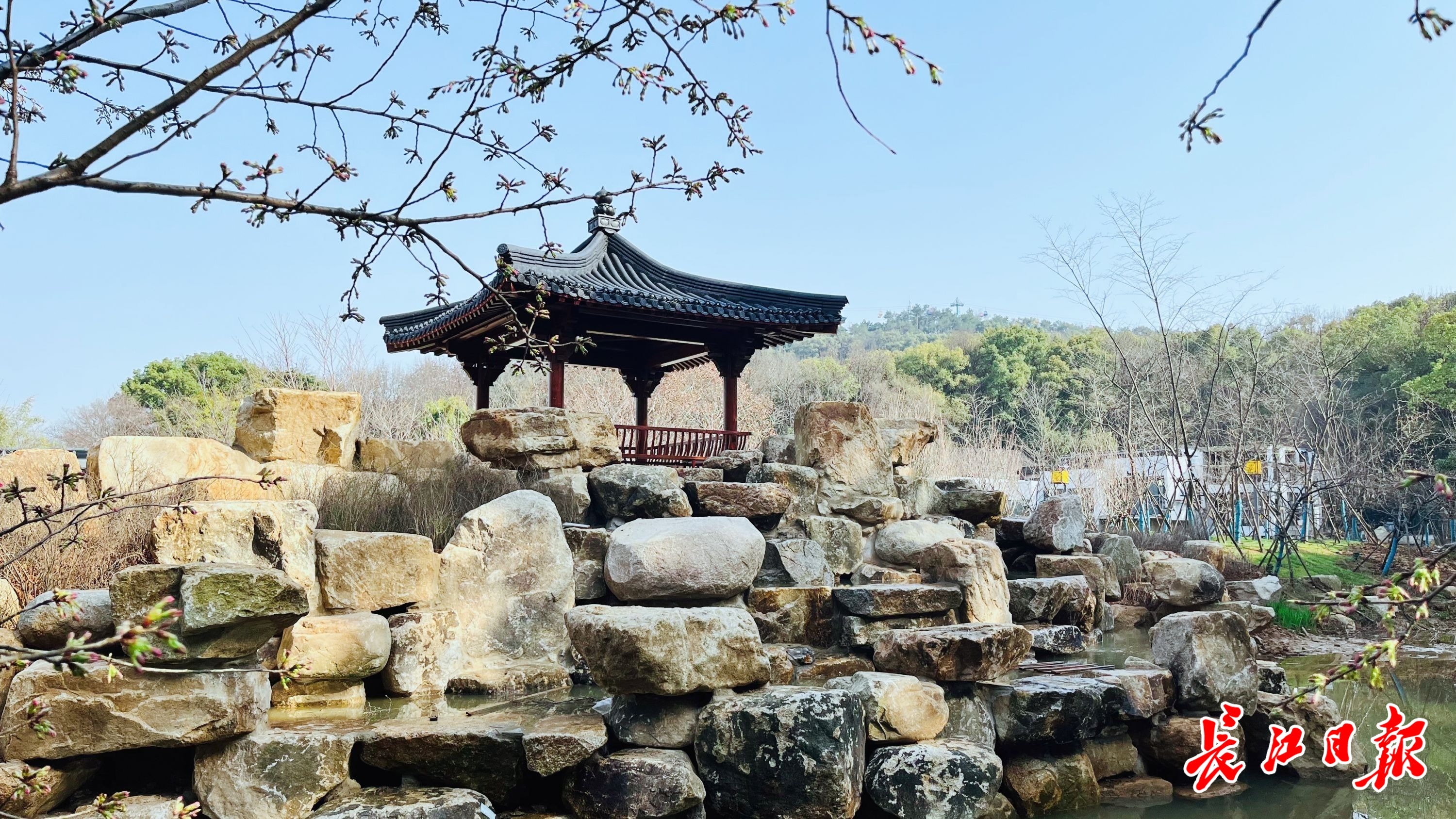 新建的景观名称也颇具诗意,小池西洲、浔樱花涧、杉林梦境、平桥卧波等。记者穿过樟树林,浔樱花涧景观位于眼前诸多叠石组成的半岛之上,溪水绕岛流过,瀑布从叠石上缓缓流下,拾级而上登临楚风建筑风格的浔樱亭,樱花树围绕四周,奇石异境,宛若穿越到古代园林。