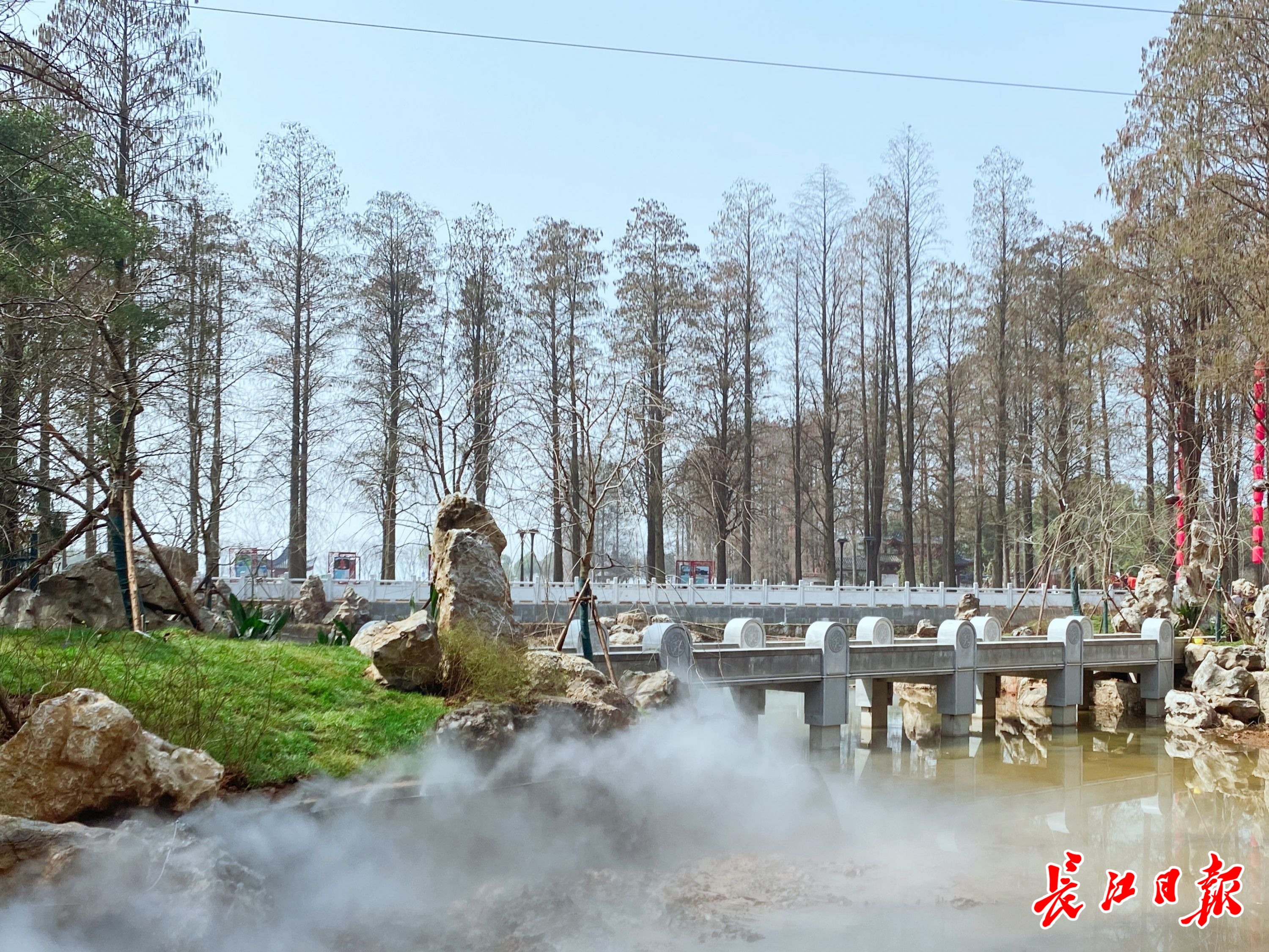 3月7日,长江日报记者提前从东湖磨山景区南门进入到全新的东湖樱花园,眼前的景象令人惊奇,大门右侧的休闲区域摇身变成云雾缭绕、流水潺潺、叠石点缀的座座半岛,四个各具特色的小桥将其连通,樱花树错落有致生长在驳岸旁,许多为垂枝樱,或为树枝倾斜的樱花,含苞的樱花枝条垂向池塘,颇有一番意境。