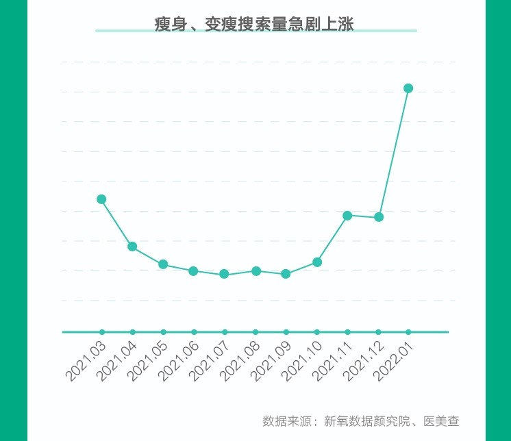 天暖塑形忙,享“瘦”正当时。新氧数据颜究院&医美查数据显示,年初,人们对瘦身的关注度急剧上涨,2022年1月“瘦身”“变瘦”搜索次数环比增长130.61%。