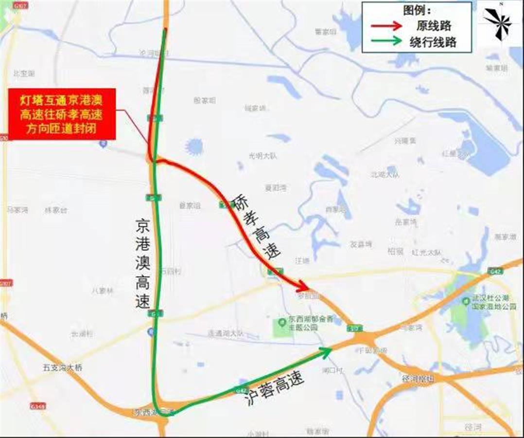 高速交警提示,该匝道封闭期间,请广大驾驶员合理规划行车路线,绕开施工匝道。京港澳高速港澳方向需通行硚孝高速的机动车,请沿京港澳高速直行至武汉绕城高速东西湖互通(红羽村互通),往机场方向前往硚孝高速。