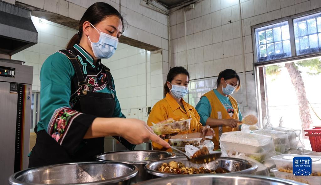 3月7日,在百色车务段八渡站,布依族厨娘在厨房分装盒饭。