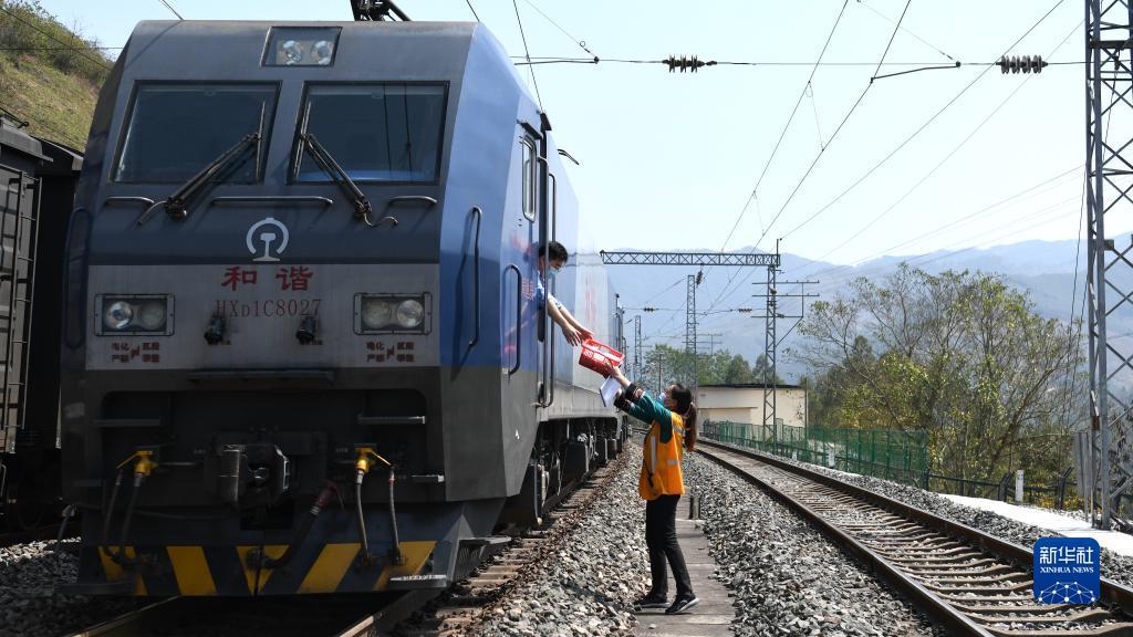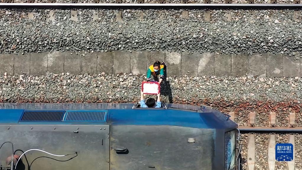 3月7日,在百色车务段八渡站,一名布依族厨娘给火车司机送午餐(无人机照片)。