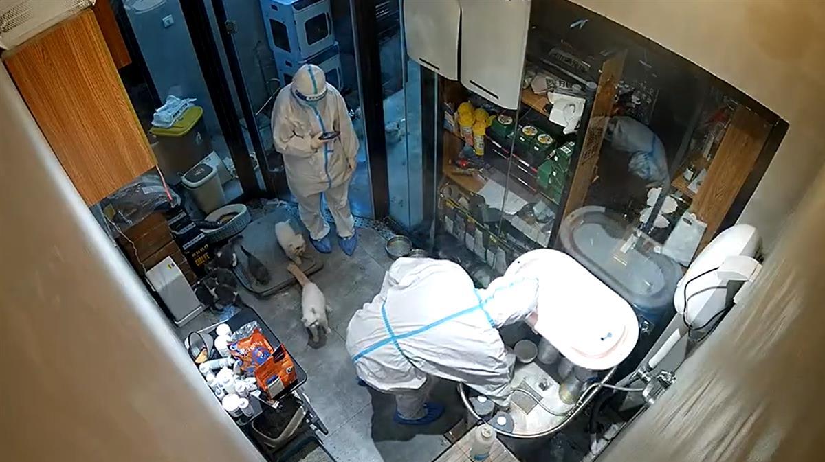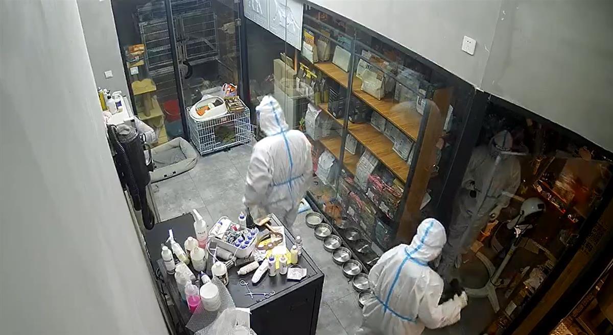 监控视频显示,三位身穿白色防护服工作人员中,有两人进入宠物房,房间内有三只小狗,其中一人在店内为宠物们找寻狗粮投喂,另一工作人员则拿着手机拍照,记录喂养过程。三只小狗来回在房间跑动,时而发出叫声。