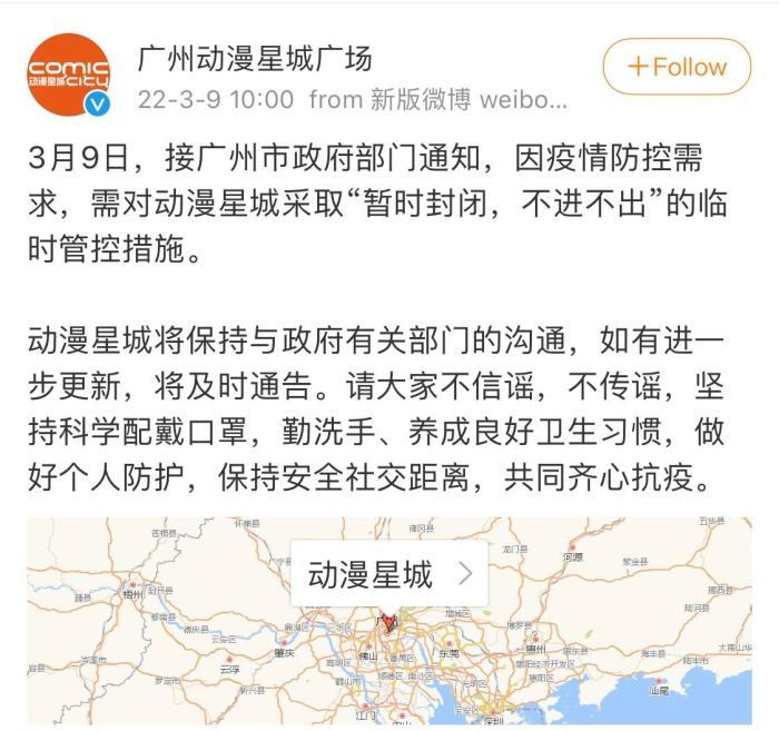 中新网广州3月9日电 (记者 蔡敏婕)9日,广州动漫星城广场通过官方平台发布消息称,接广州市政府部门通知,因疫情防控需求,需对动漫星城采取“暂时封闭,不进不出”的临时管控措施。