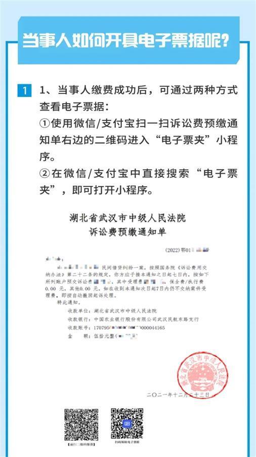 3月7日起,当事人通过武汉司法送达小程序电子签收黄陂法院诉讼费预缴通知单,通过扫码诉讼费预缴通知单左下方的缴费二维码缴纳诉讼费后,即可扫码通知单右下方的电子票据码,下载领取诉讼费电子专用票据。承办法官也可通过审判系统,将电子票据生成PDF格式自动引入智能卷宗,跟随结案归档。