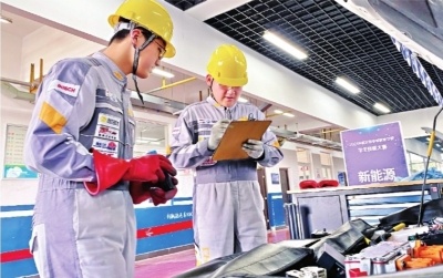 两位新能源汽车专业的学生正在备战全国职业院校技能大赛。见习记者胡慧怡 摄