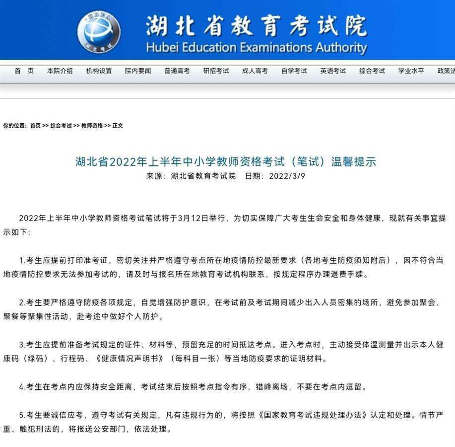 湖北日报讯(记者方琳)3月12日,2022年上半年中小学教师资格考试笔试开考。为切实保障广大考生生命安全和身体健康,各考区已提前发布考试有关事宜,提醒考生安全顺利参考。