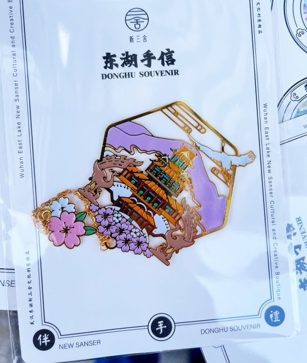 粉红色花瓣形状的樱花油纸伞、散发着淡淡幽香的樱花扩香石、正反两面绣着浪漫樱花的团扇、樱花飘飘的粉色风铃、樱花掩映下的楚天台及五重塔图案精致书签……在位于东湖樱花园虹桥附近的文创摊位上,整齐码放着大到樱花伞、樱花夜灯,小到樱花手工皂、樱花香包等数十种樱花主题文创产品,这一“粉色风景”吸引游客关注。