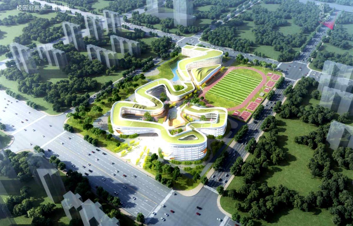 光谷五高位于高新二路以北、桃林路以东,用地面积约118亩,规划48个班,总建筑面积约10万方。该中学概念设计方案设计主题为“光谷绿芽,绽放未来”,俯瞰造型如同在大地上投下一颗希望的种子,建筑似破土萌发的绿芽,从北向南自由生长。