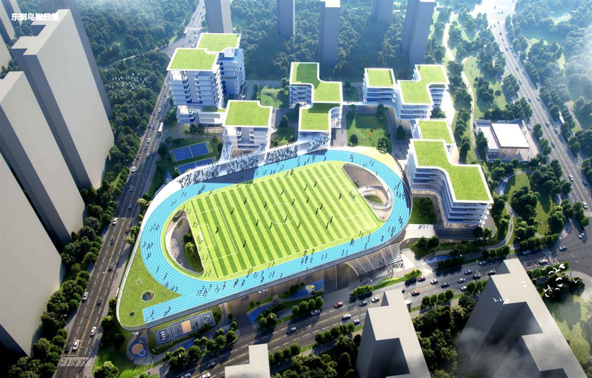 设计建筑屋面起伏,由若干连续舒展的曲线构成。特别是楼层局部采用退台设计,校园建筑的天际线起伏有致,富有变化,不同标高的屋顶通过坡道、景观台阶相连,在屋顶打造一条连续的“登山道”,供孩子们探索。