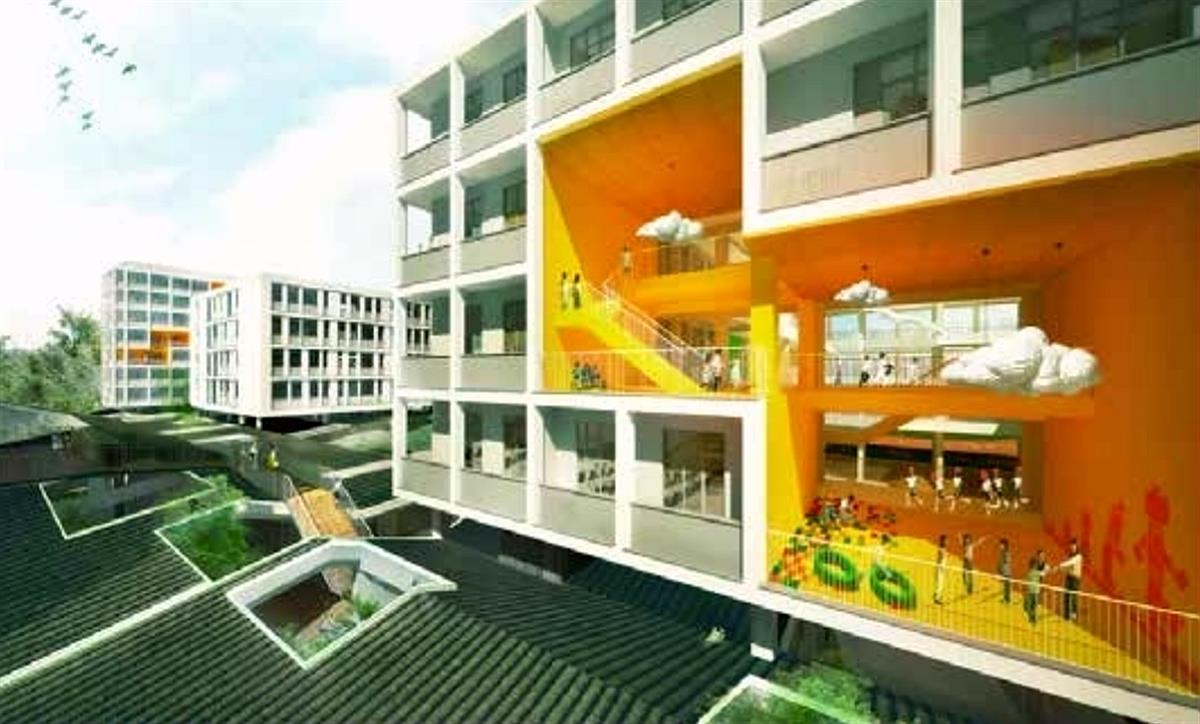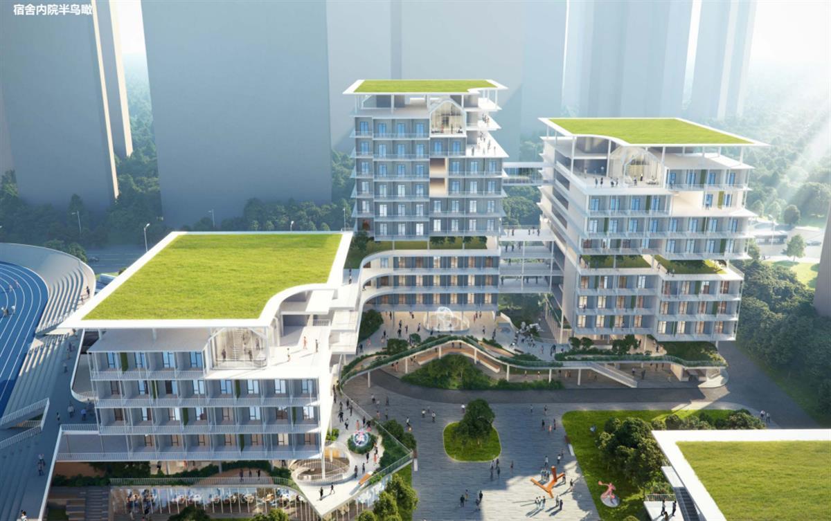 该高中概念设计方案主题为“青峰绿谷”,呼应学校所在地的自然风貌,采取高密度校园下的“低密度”设计策略,采用工业模块的建构,使公园、操场、社区绿地相互延伸,在不同时段进行共享。