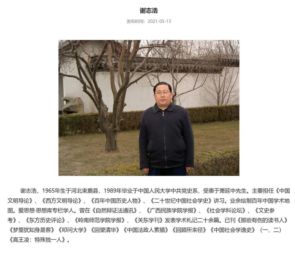 河北科技大学文法学院官网显示,57岁的谢志浩教授1989年毕业于中国人民大学中共党史系,受惠于萧延中先生。主要担任《中国文明导论》、《西方文明导论》、《百年中国历史人物》讲习。业余绘制百年中国学术地图。